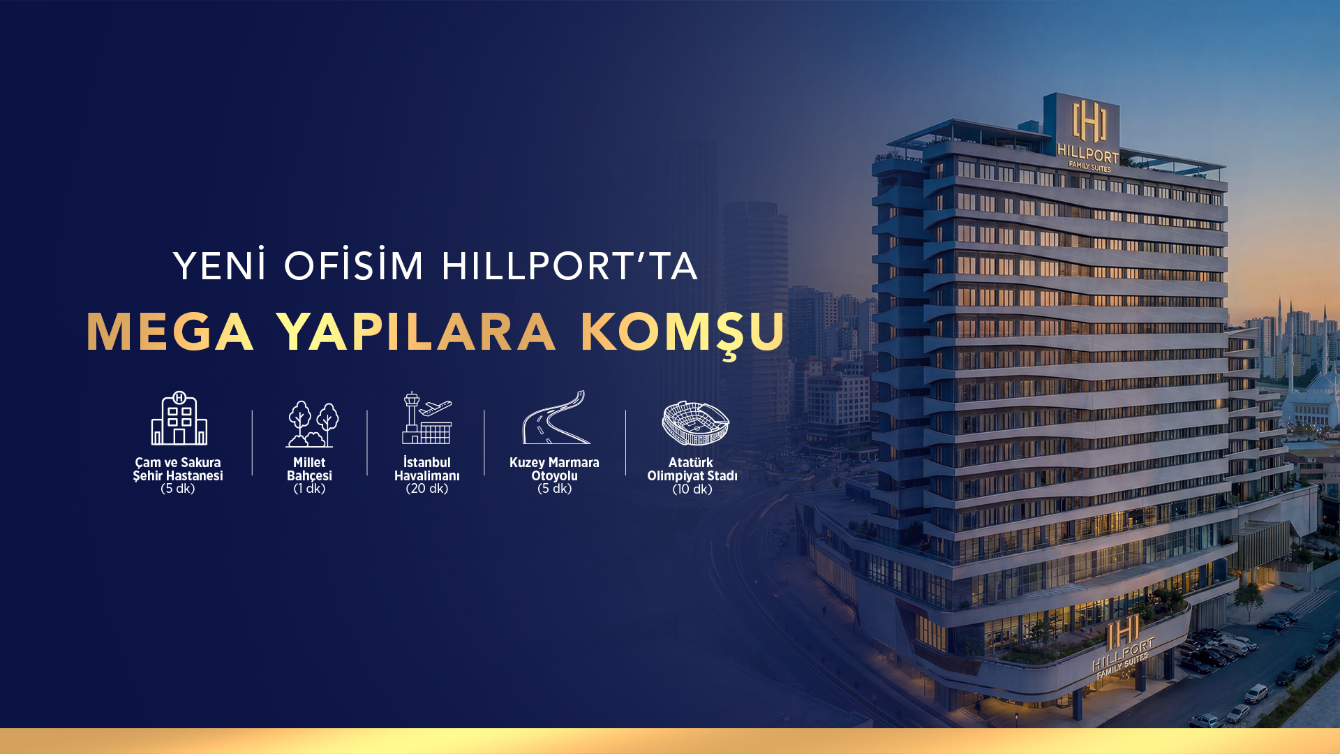 Hillport, Başakşehir Kayaşehir’de, 120.000 m² büyüklüğündeki V Mall İstanbul’un üzerinde konumlanır. Metro istasyonuna sadece 5 dakika mesafede yer alan proje; Başakşehir Millet Bahçesi, Başakşehir Kent Meydanı, Kuzey Yakası Ofisleri ve Başakşehir Merkez Camii gibi önemli noktaların tam ortasında bulunur. Ayrıca İstanbul Havalimanı’na yaklaşık 10 dakika uzaklığıyla, şehir içi ve şehirler arası ulaşımda önemli bir avantaj sunar.